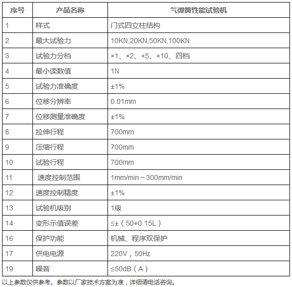 该系列试验机是按照国标QC/T207-1996和JB/T8064.1~ 8064.2-96规定的气弹簧试验规范而设计制造的专用测试设备。可自动完成气弹簧的整个循环测试环境,也可单独测定气弹簧某个参数,并自动打印出试验结果。适用于气体弹簧的拉力、压力、位移、曲线等试验和分析。